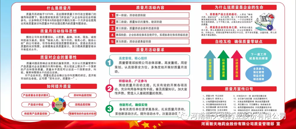 每年9月为全国“质量月”,“质量月”是在政府有关部门的倡导和部署下,由全社会尤其是广大企业积极参与的年度专题活动,旨在提高全民质量意识与质量管理水平。根据国家质量月活动安排,结合公司发展战略,提升员工质量意识,增强企业凝聚力和市场竞争力,2021年“质量月”公司活动主题为“践行质量标准化,再谱医药新时代”。围绕“做救人药、做平价药、做良心药、做放心药”使命,以质量、品牌、标准、服务、诚信和效益为重点,实现公司年度质量目标。本次质量月活动旨在营造全员关注质量氛围、提高质量意识,从而提升企业质量管理水平和制造技术水平。